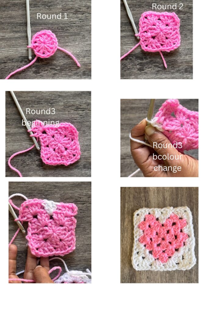 In this pattern, I am reducing the number of chains between the granny clusters. Now let us begin the photo tutorial here. Start with a magic ring. In the first round, you will make 3 dcs separated by 1 chain. In the next round on each chain 1 space, we will make 3dc, ch2, 3 dc. On the 3rd round we will learn to do colour changing.